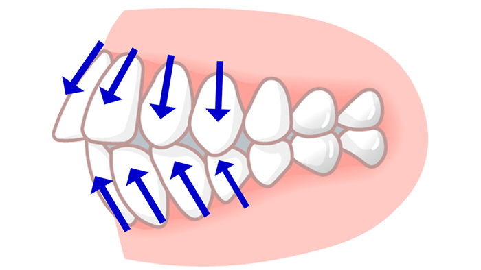 それでも強引に歯を動かそうとすると、右図のように前歯が外に押し出されてしまうことに…。これが出っ歯や口ゴボを発症する原因になるのです。