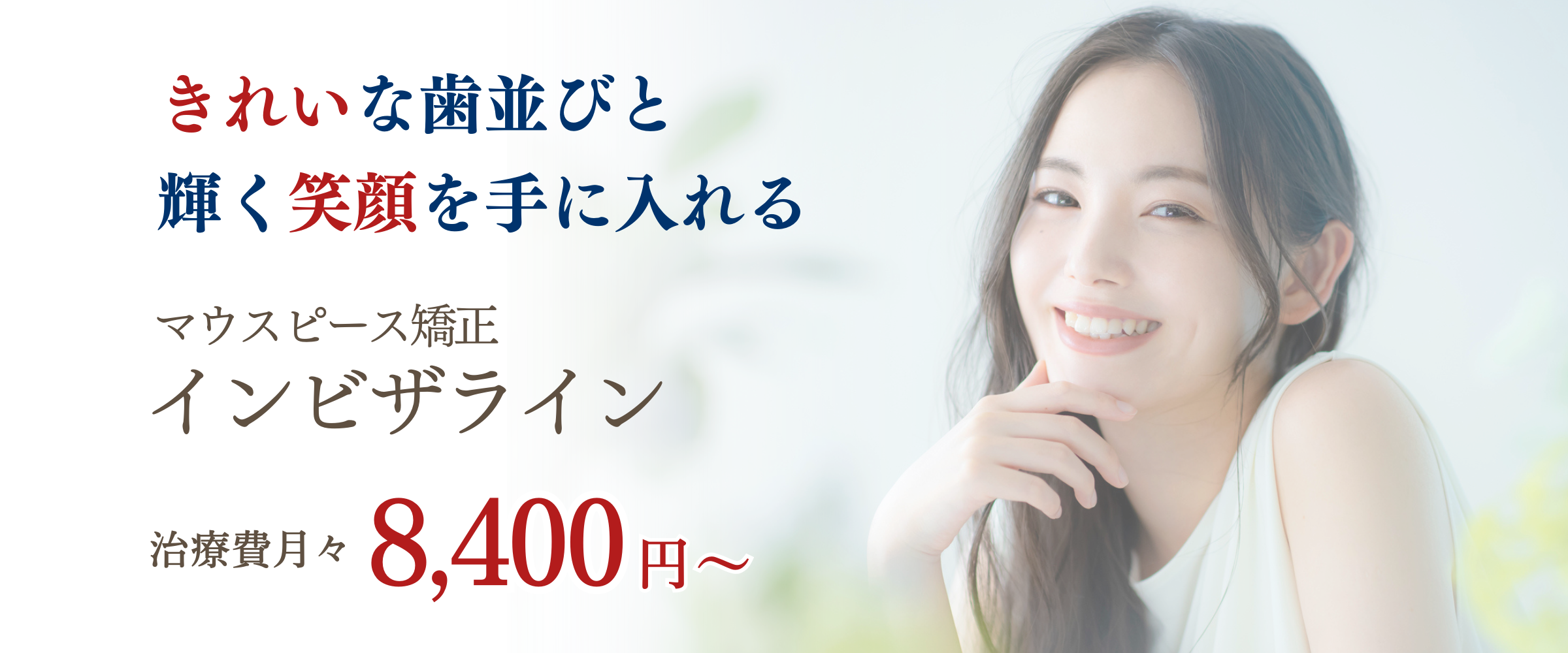 当院では、矯正歯科で20年以上の経験を持つインビザラインドクターの院長が、透明で目立たないマウスピース矯正「インビザライン」を月々8,400円とお安く提供中。